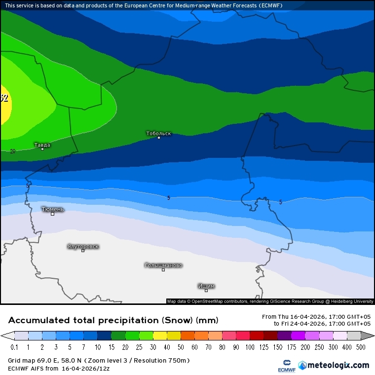 В Тюмени до утра 23 апреля может выпасть 15–20 мм осадков. Основной удар стихии придется на север региона. В Тобольске прогнозируется до 30–35 мм, что на 15–35 % превышает месячную норму. Там же возможно образование снежного покрова высотой 10–15 см. К утру 21 апреля на севере области высота снега достигнет около 10 см.